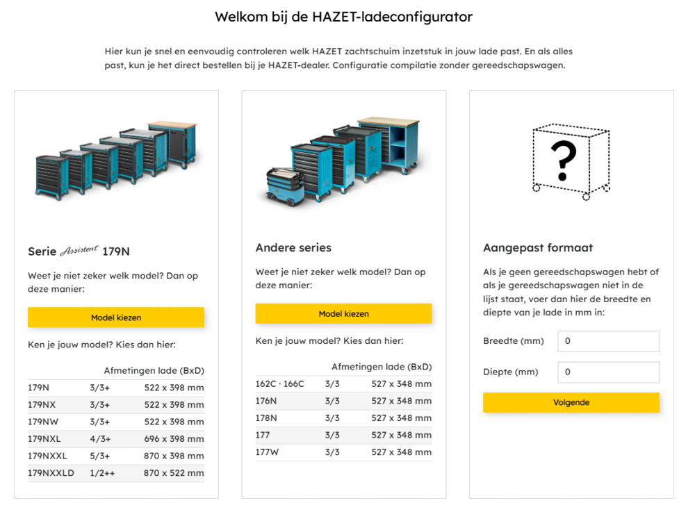 Heeft u een Hazet gereedschapswagen en wilt u de lades samenstellen met nieuw gereedschap gesorteerd in een schuiminleg? Doe dit nu eenvoudig en snel met de Hazet lade assortiment configurator. Kies met een paar kliks uw model of voer simpelweg de breedte en diepte van de lade in en zie direct hoe u uw gereedschapswagen overzichtelijk en efficiënt inricht.