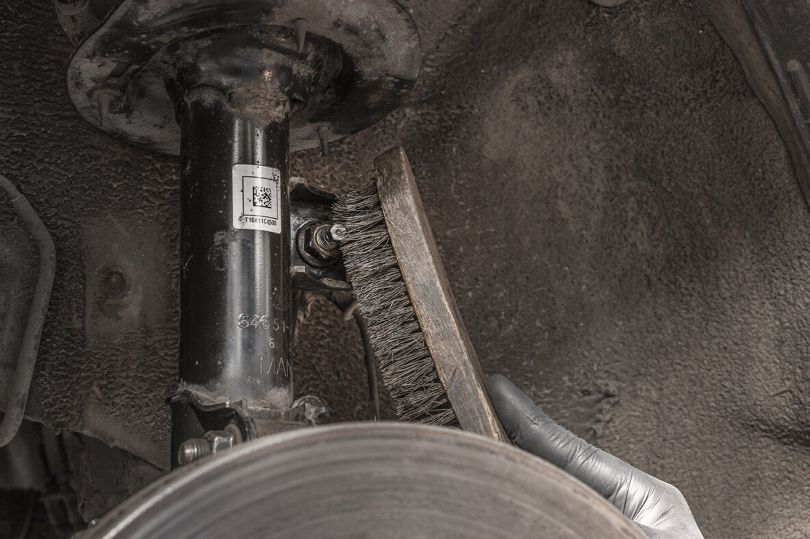 - Spuit vervolgens kruipolie op de moer van het spoorstangeind en op de vastzetmoer van de axiaal.